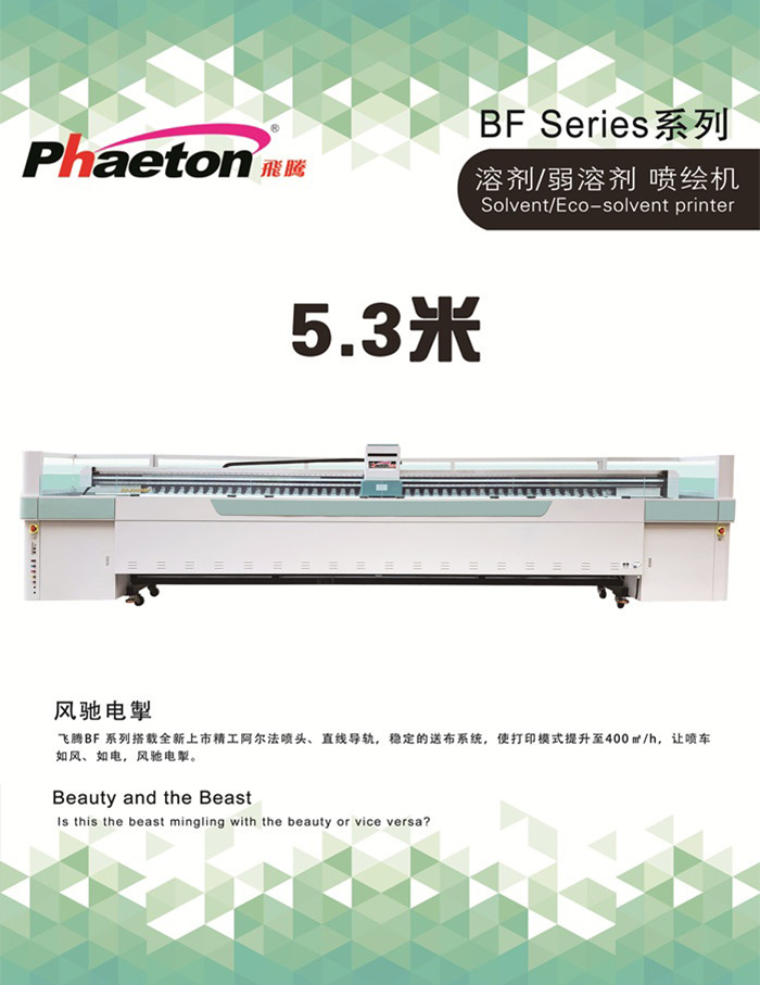 飛騰BF系列搭載全新上市精工阿爾法噴頭、直線導(dǎo)軌,穩(wěn)定的送布系統(tǒng),使打印模式提升至400㎡/h,讓噴車如風、如電,風馳電掣。