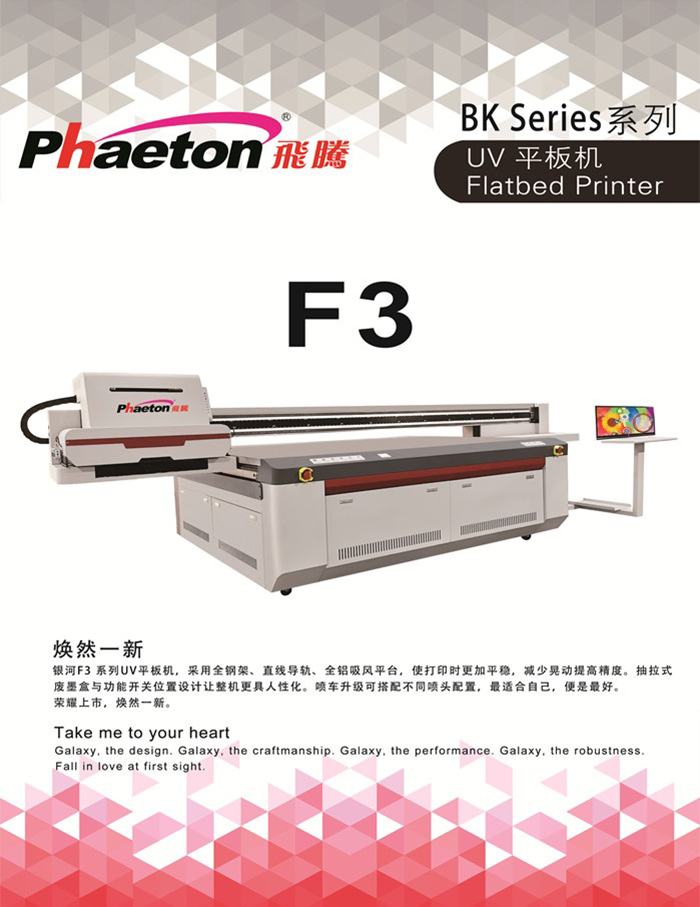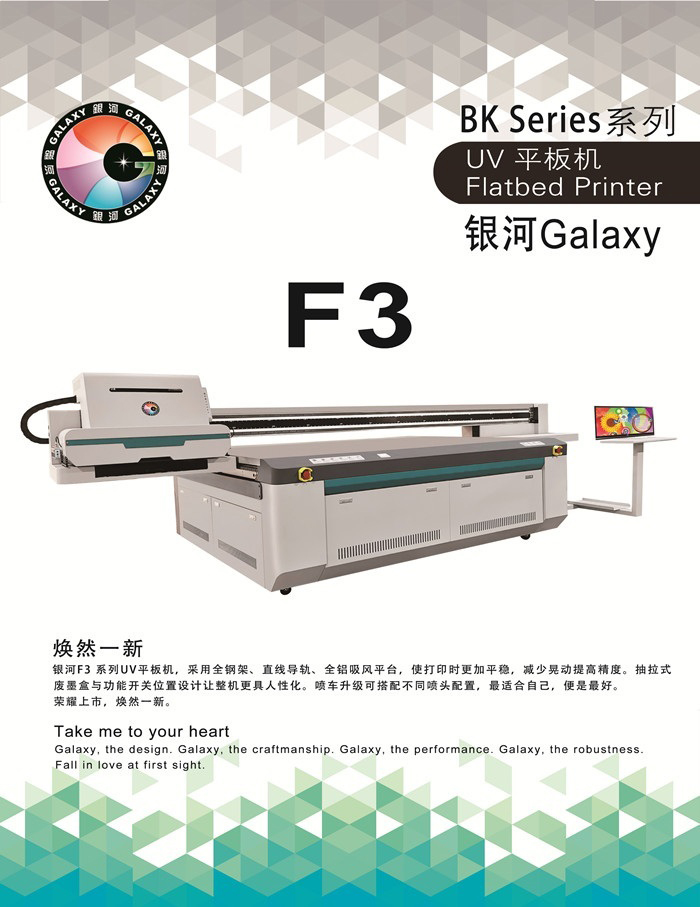 銀河F3系列UV平板機,采用全鋼架、直線導(dǎo)軌、全鋁吸風平臺,使打印時更加平穩(wěn),減少晃動提高精度。抽拉式廢墨盒與功能開關(guān)位置設(shè)計讓整機更具人性化。噴車升級可搭配不同噴頭配置,最適合自己,便是最好。 榮耀上市,煥然一新。